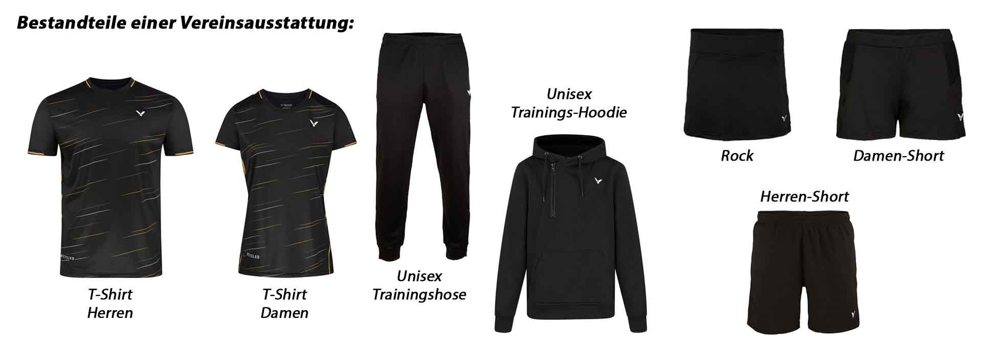 Eine Vereins- oder Mannschaftsausstattung besteht in der Regel aus einem Trikot und einer kurzen Hose oder einem Sportrock. Zusätzlich kaufen die meisten Vereine optional eine lange Trainingshose und eine Trainingsjacke bzw. Pullover oder Hoodie dazu. Insbesondere der Hoodie kann für Verein und Sponsoren eine attraktive Werbefläche darstellen.