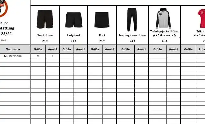 Bei der Organisation einer Vereinsausstattung sind wir immer gerne behilflich. Die meisten Vereine sammeln durch den Mannschaftsführer oder der Abteilungsvertretung die Mengen und Größen per Mail ein oder nutzen dazu eine Online-Excel Tabelle, bei der die Mitglieder und Interessenten ihren Namen, Mengen und Kleidergrößen direkt selber eintragen können. Optional können die Mitglieder auch Angaben, ob und welchen Spielernamen sie bei Bedarf auf Ihr Trikot gedruckt haben möchten, machen. In einer Excel-Tabelle können so ganz leicht die Gesamtkosten pro Mitglieder errechnet werden.