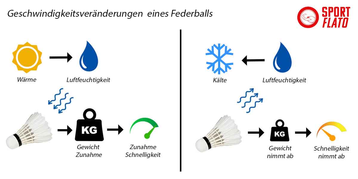 Federbälle verändern sich hinsichtlich ihrer Flugeigenschaften und Haltbarkeit aufgrund von Temperatur und Luftfeuchtigkeit stark. Im Sommer, wenn überwiegend wärmere Temperaturen herrschen, steigt in der Regel auch die Luftfeuchtigkeit. Die Federn saugen diese Luftfeuchtigkeit auf und werden somit schwerer. Ein schwerer Federball fliegt automatisch schneller. Im Winter, wenn es überwiegend kalt und die Luft trocken ist, verliert der Federball an Feuchtigkeit und damit auch an Gewicht. Ein leichterer Federball fliegt damit deutlich langsamer.