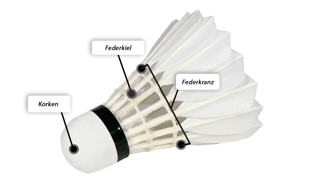 Der Federball besteht im wesentlichen aus zwei Bestandteilen, dem Korken (Basis) und dem Federkleid.